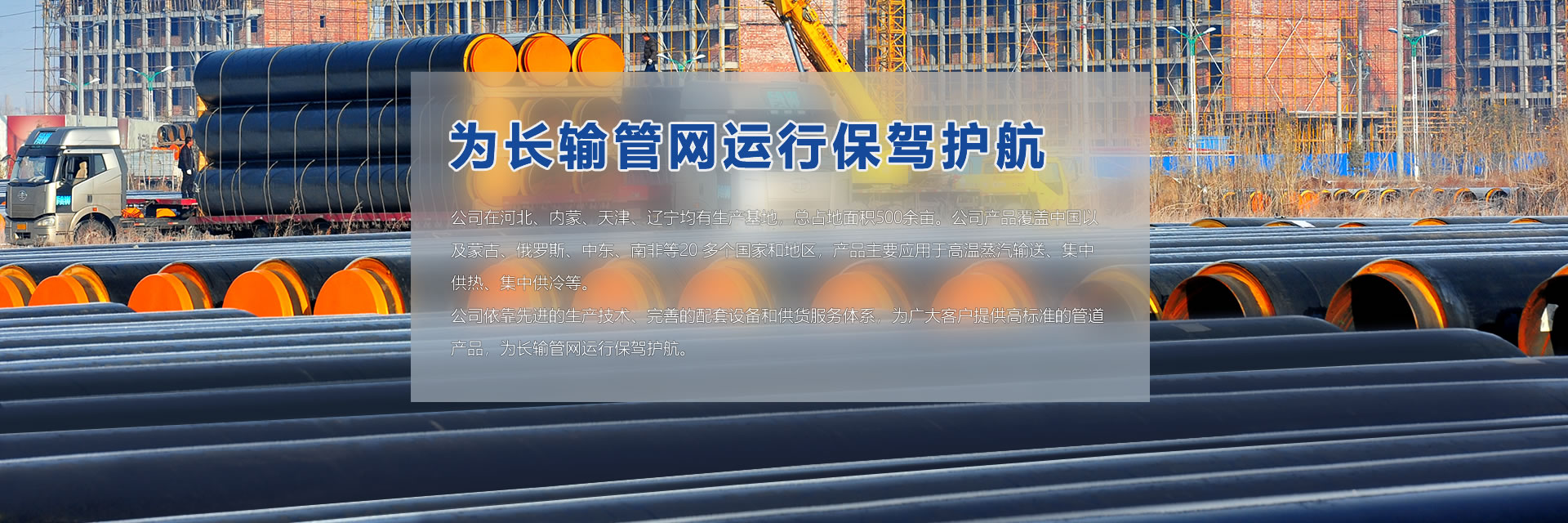 公司在河北、內(nèi)蒙、天津、遼寧均有生產(chǎn)基地,總占地面積500余畝。公司產(chǎn)品覆蓋中國(guó)以及蒙古、俄羅斯、中東、南非等20 多個(gè)國(guó)家和地區(qū),產(chǎn)品主要應(yīng)用于高溫蒸汽輸送、集中供熱、集中供冷等。 公司依靠先進(jìn)的生產(chǎn)技術(shù)、完善的配套設(shè)備和供貨服務(wù)體系,為廣大客戶提供高標(biāo)準(zhǔn)的管道產(chǎn)品,為長(zhǎng)輸管網(wǎng)運(yùn)行保駕護(hù)航。